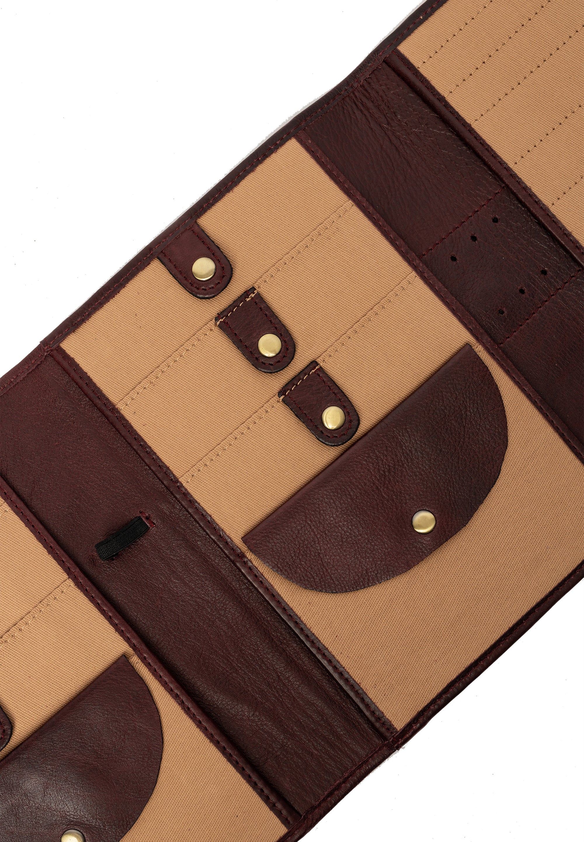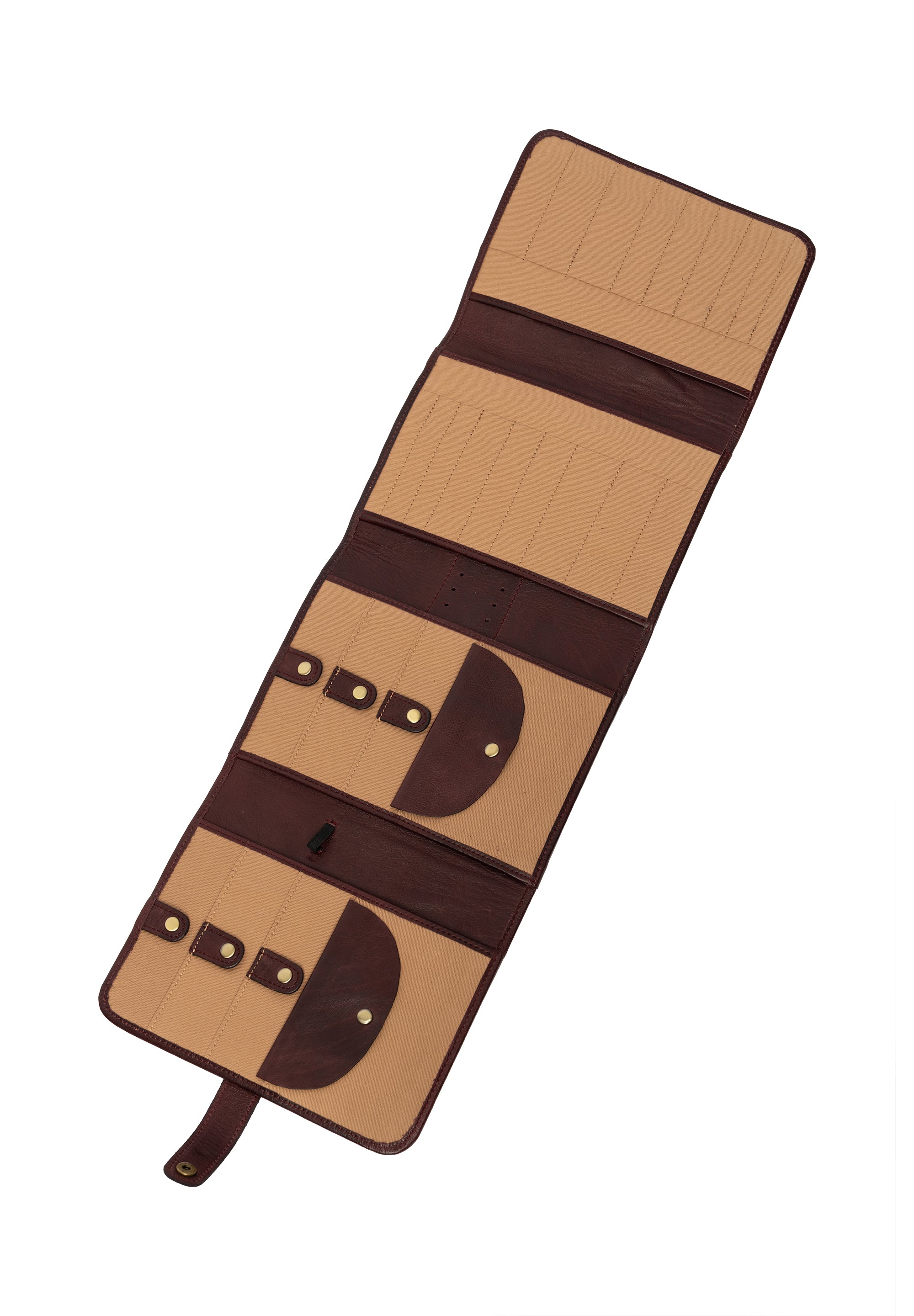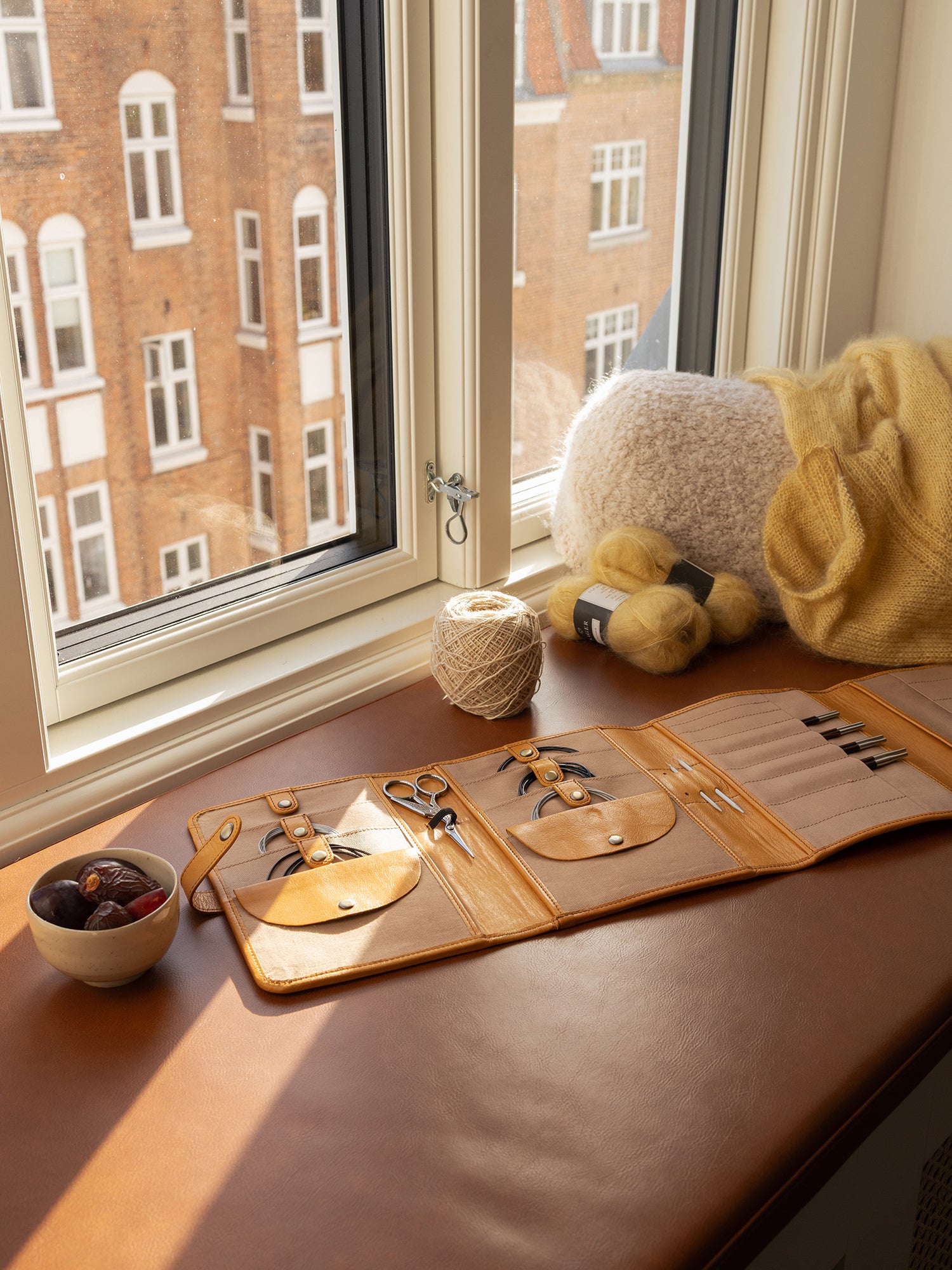 PROJET 14 est notre trousse XL pour ranger vos aiguilles à tricoter circulaires interchangeables. Elle est dotée de 6 poches à boutons-pression pour maintenir vos fils en toute sécurité. Derrière ces poches se trouvent des compartiments ouverts pour ranger vos patrons de tricot ou autres articles similaires. Un élastique vous permet de garder votre mètre ruban à portée de main, et le cuir est percé de 6 trous pour accueillir 3 aiguilles. Au total, 18 poches fines permettent de ranger vos pointes de tricot, vos crochets et vos aiguilles à tricoter. Enfin, 2 petites poches à rabat et bouton-pression vous permettent de ranger vos ciseaux et autres accessoires de tricot. La trousse se plie élégamment et se ferme par un simple bouton-pression, facilitant ainsi le transport de vos essentiels.