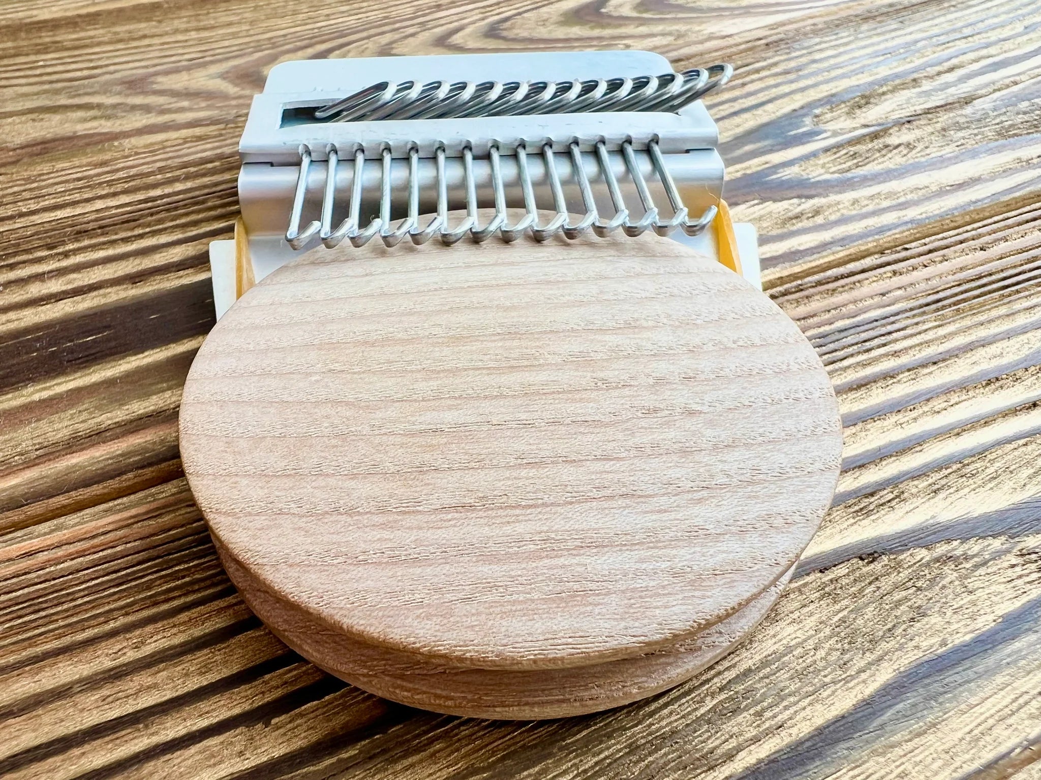 Well made construction consists of a disc made from real wood along, with a metal plate with hooks that attach easily to the disc using elastic bands. Hooks  glide effortlessly back and forth to help you weave your threads.