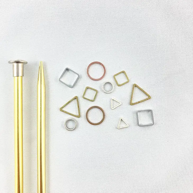 Various sizes and colours of brass shapes for your knitting needs! Rose gold plated brass, silver plated brass and raw brass. 12 total pieces per pack as seen in photo.