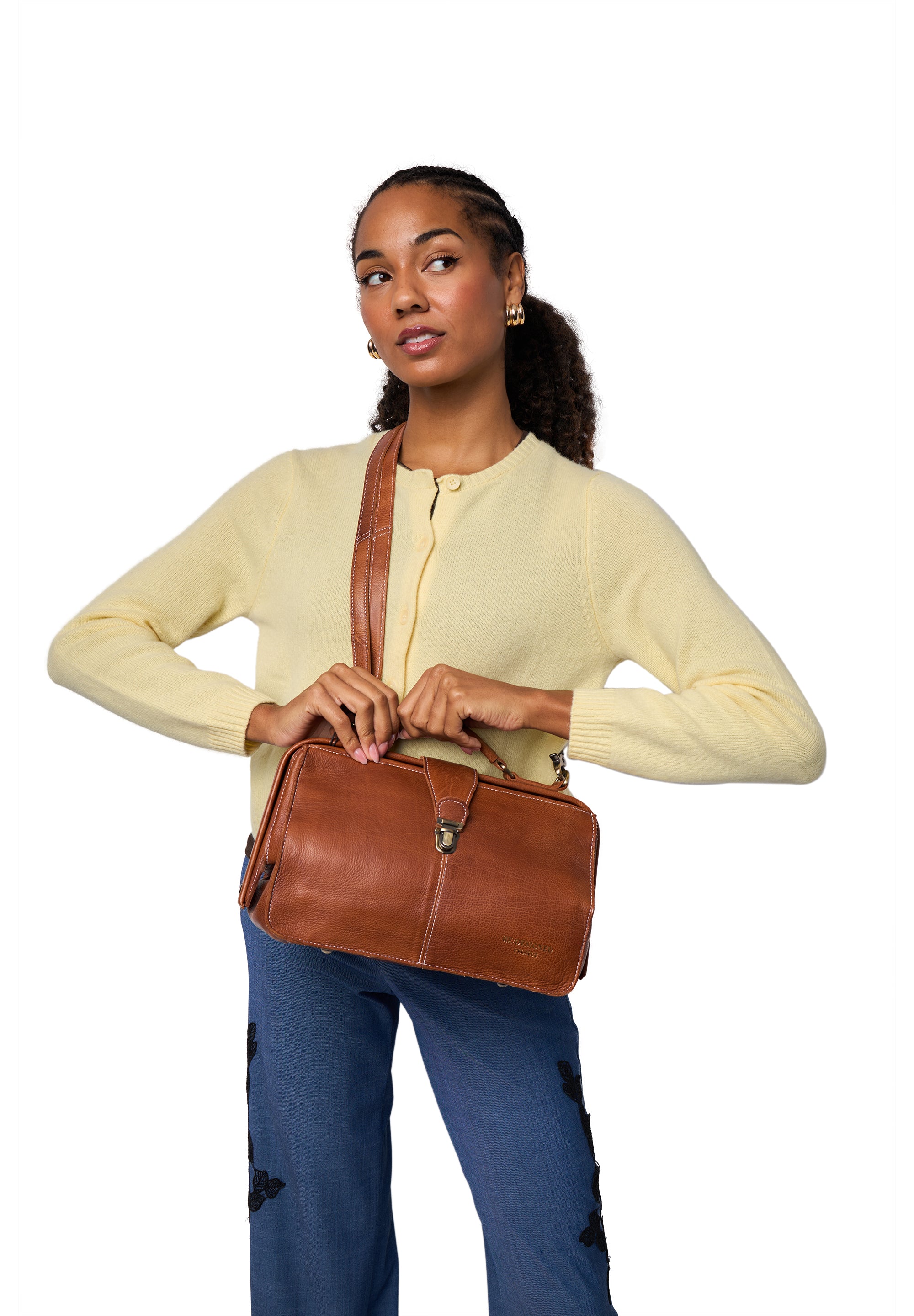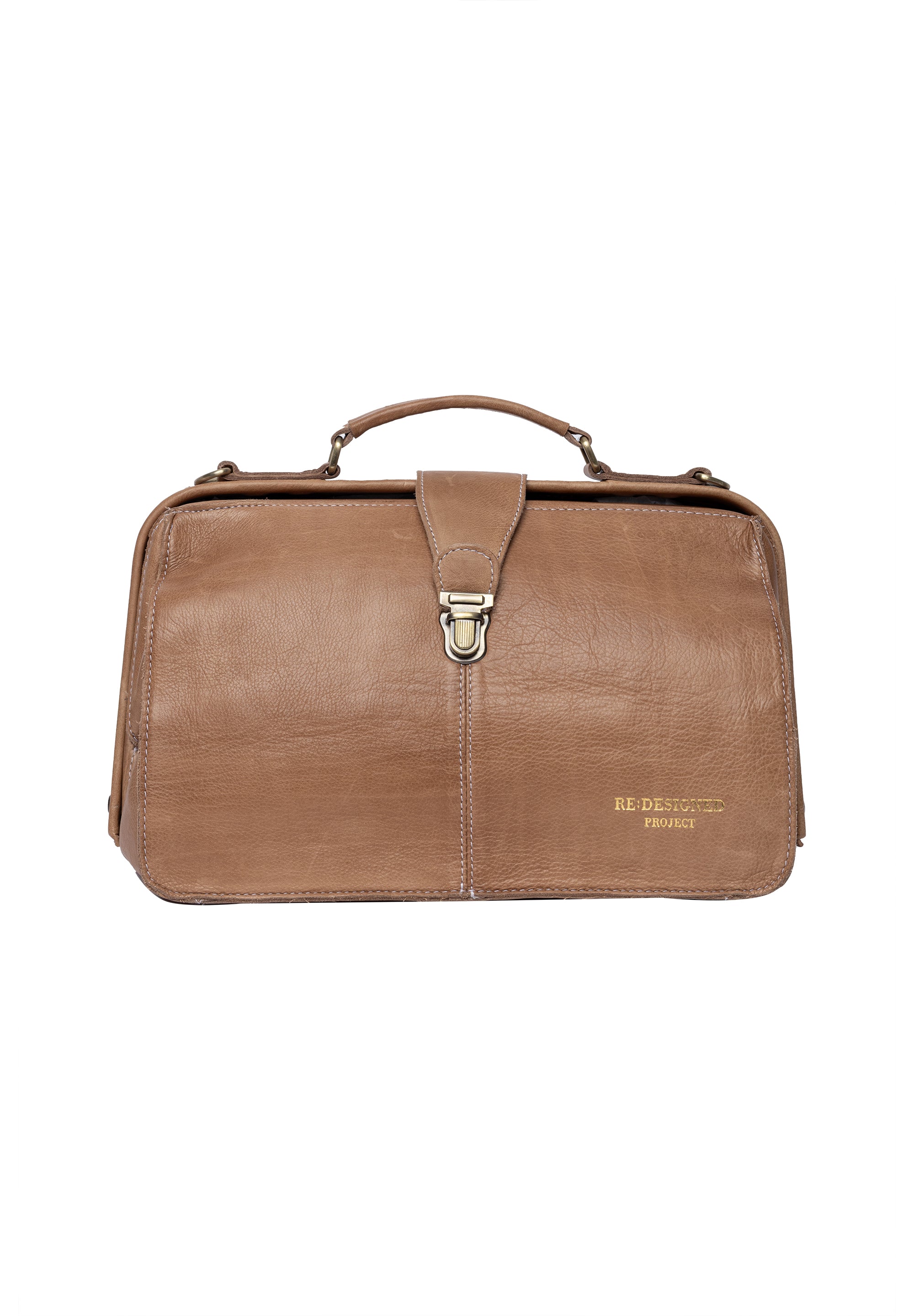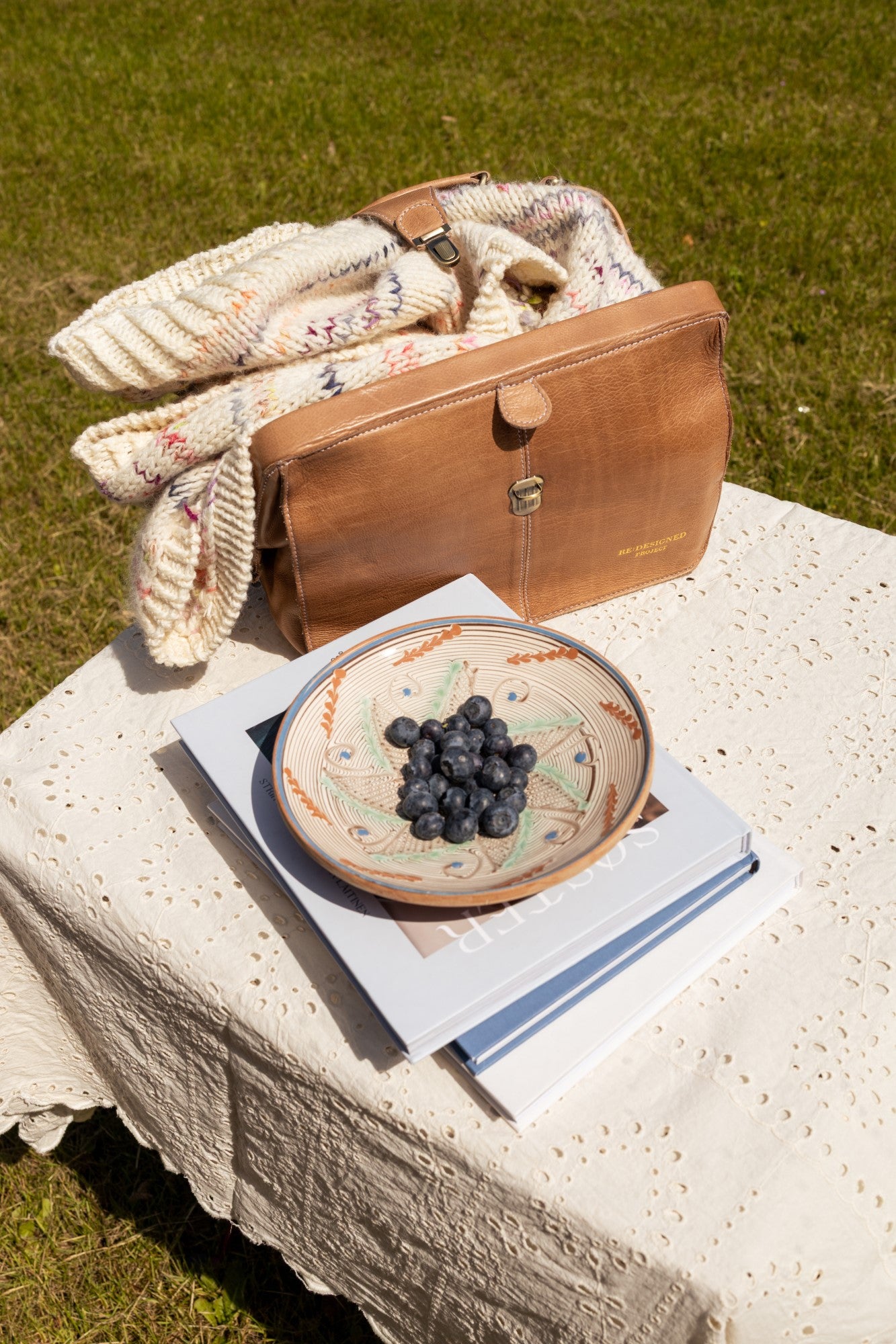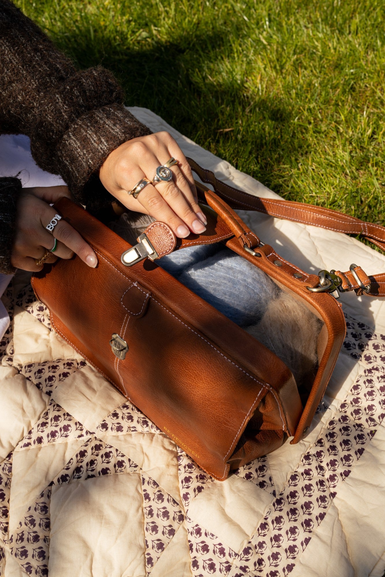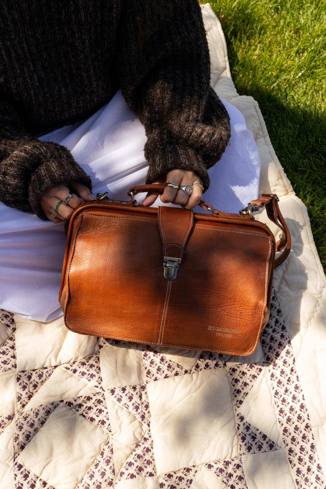 before the surface is finalized. This process preserves the leather’s natural texture, leaving each bag with unique characteristics, where no two are the same. After the dye, a light wax is applied, creating a smooth and soft finish.
